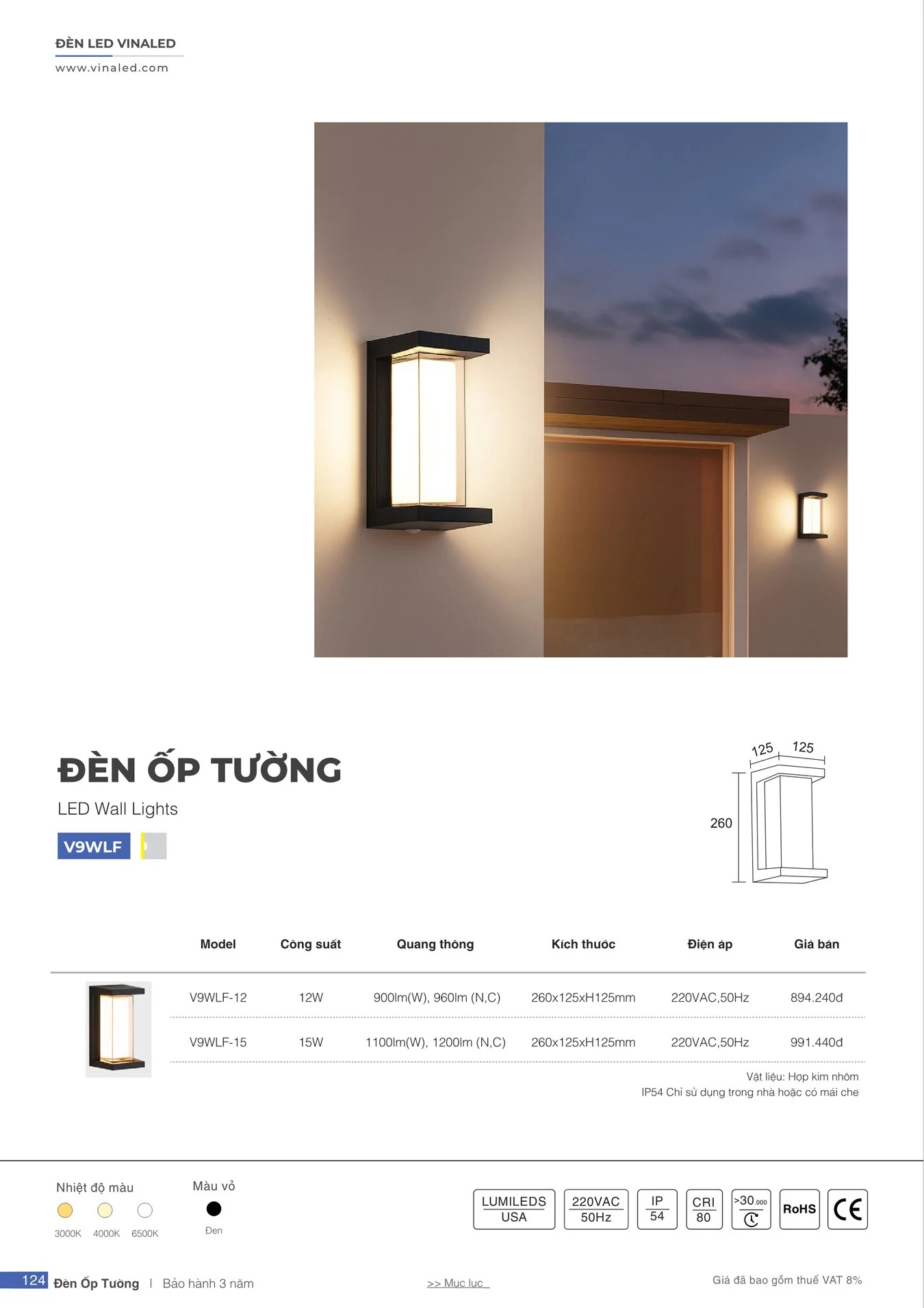 Thông số đèn led ốp tường 15W V9WLF-15 Vinaled, IP54 (WL3-FB15)