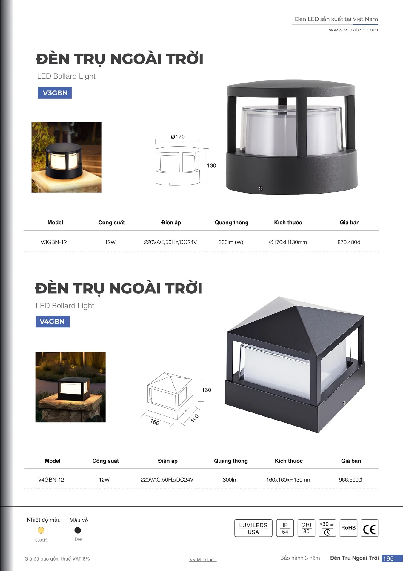 Thông số Đèn sân vườn vuông 12W V3GBN-12/GLR-DB12 Vinaled