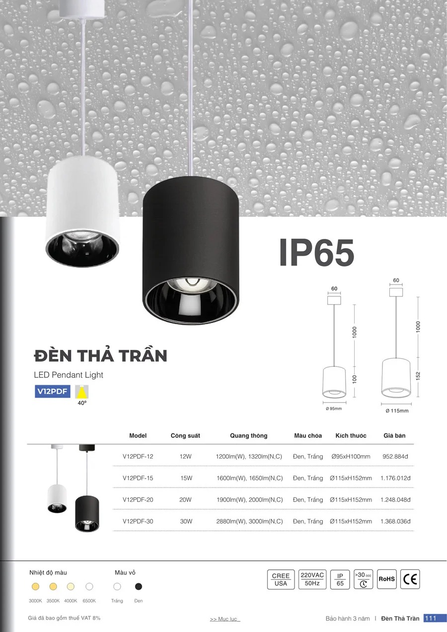 Thông số đèn thả trần ngoài trời IP65 20W V12PDF-20 VinaLed (trắng/đen)