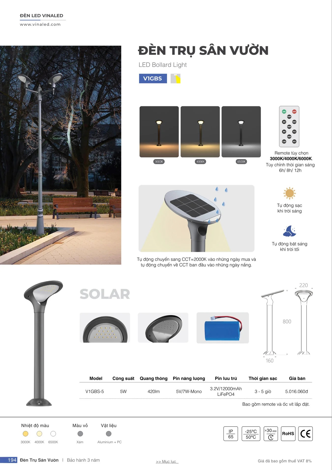 Thông số đèn trụ sân vườn năng lượng mặt trời 5W V1GBS-5 Vinaled