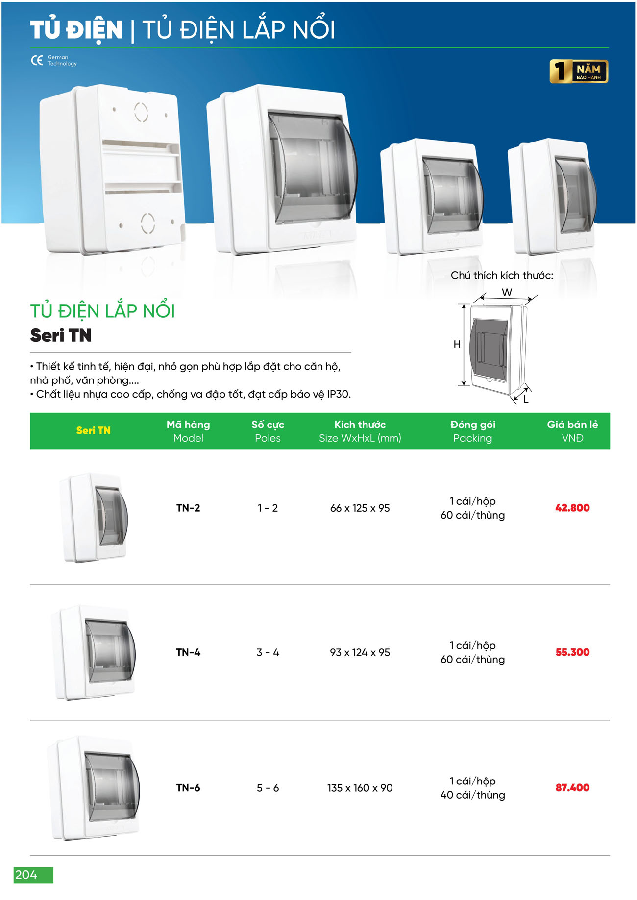 Thông số Tủ điện lắp nổi IP30 TN-6 MPE (chứa 5-6 cực)